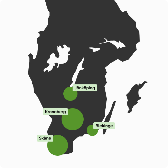 Vi finns i hela sydöstra Sverige och är verksamma i Kronoberg, Skåne, Jönköping och Blekinge med omnejd.